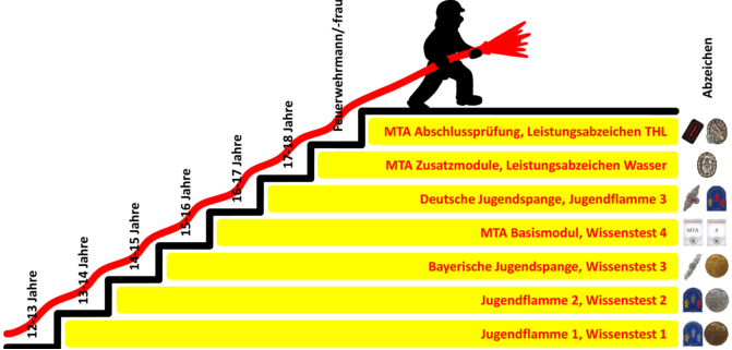 Die Ausbildung zum Feuerwehrmann/frau ist in verschiedene Bereiche aufgeteilt. Diese Bereiche sind den verschiedenen Altersstufen angepasst und die Inhalte der jeweiligen Stufe werden durch unsere Jugendwarte und Ausbilder vermittelt.MTA = Modulare Truppausbildung (Feuerwehr Grundausbildung)Jugendflammme = Leistungsprüfung / LeistungsabzeichenWissenstest = Theoretische Prüfung